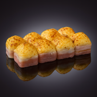Копчёное куриное филе, сочный бекон, лист салата, икра Тобико. Запекается в чесночном соусе под сыром Пармезан и Гауда