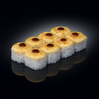 Куриная грудка, японский омлет, творожный сыр, лук фри, соус Терияки под шапкой из сыра Моцарелла и Пармезан