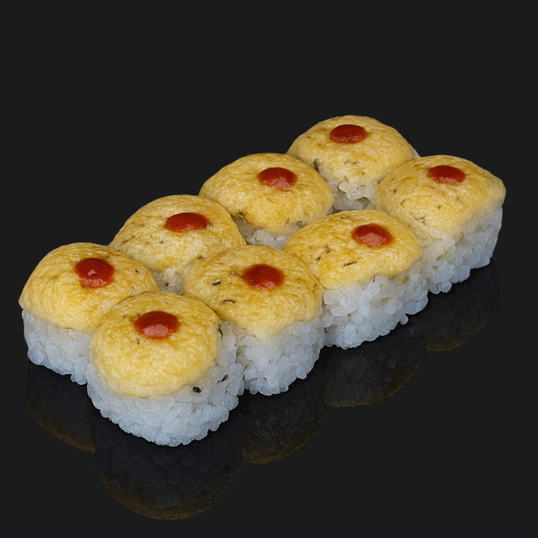 Внутри копчёная куриная грудка, сливочный сыр, зелёный лук. Ролл запекается под шапочкой из сыра Гауда со свежей зеленью и чесноком.