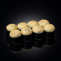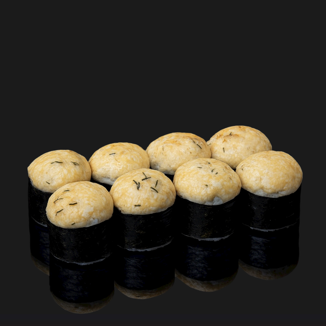 Внутри творожный сыр, а сверху запечённая шапочка из сыра Гауда со свежей зеленью и чесноком