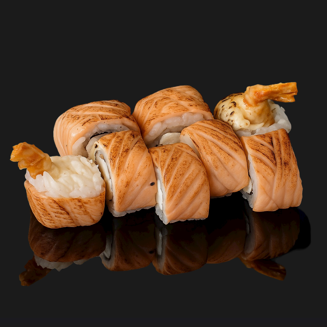 Фирменный ролл обжаренный на открытом огне. Хрустящая креветка, лосось, мягкий сливочный сыр с деликатно дополненным спелым бананом. Великолепное сочетание!