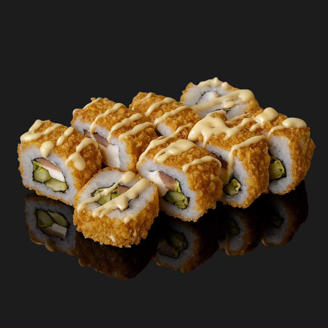Хрустящий ролл в луковой панировке. Аппетитная курица-гриль, свежий огурец, помидор, салат Айсберг, сливочный сыр, соус Яки