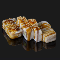 Особенный ролл. Идеальное сочетание копчёного угря, копчёного лосося, сливочного сыра, авокадо, соуса Унаги и кунжута