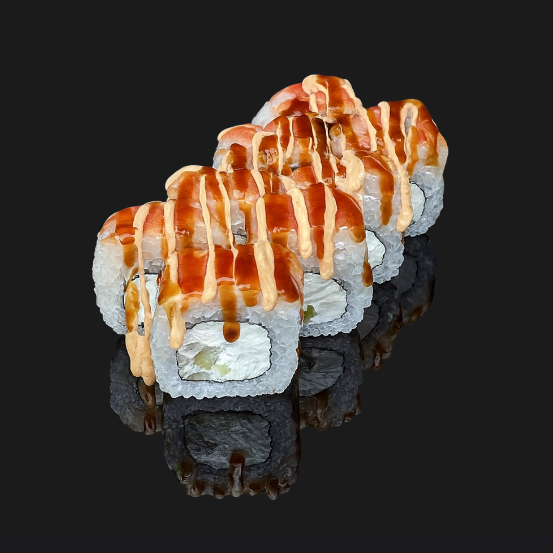 Тигровая креветка, снежный краб, сливочный сыр, свежий огурец, соус Терияки, соус Спайси