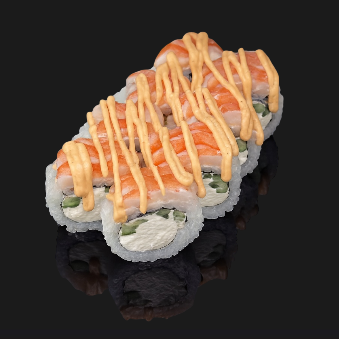 Филадельфия классическая с креветкой. Свежий огурец, пикантный соус Спайси