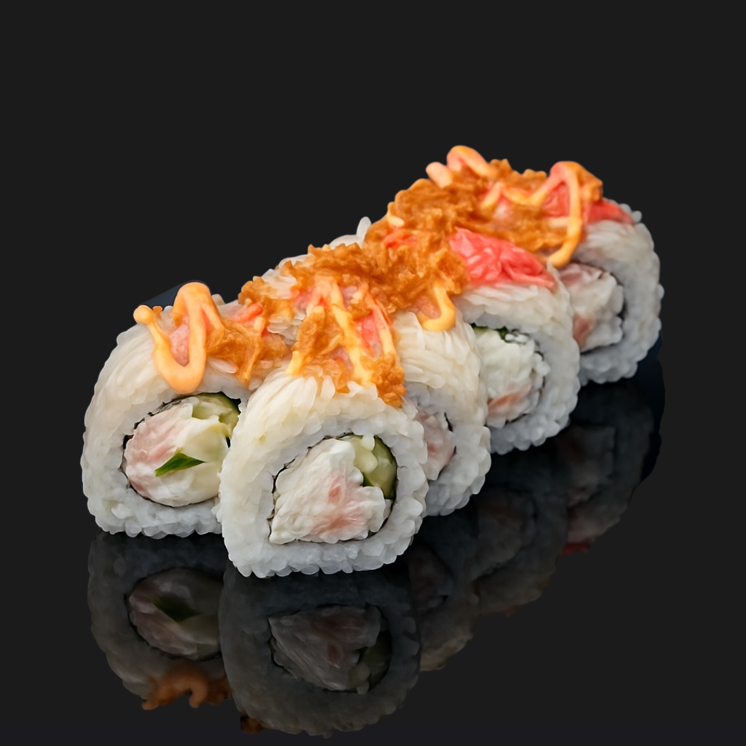 Крабовое мясо, отборные тигровые креветки, творожный сыр, свежий огурец, ролл украшен луком фри и соусом Спайси