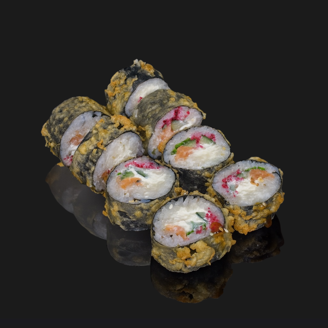 Лосось, сливочный сыр, огурец, зеленый лук, икра летучей рыбы Тобико. Обжарен в лёгкой пшеничной панировке
