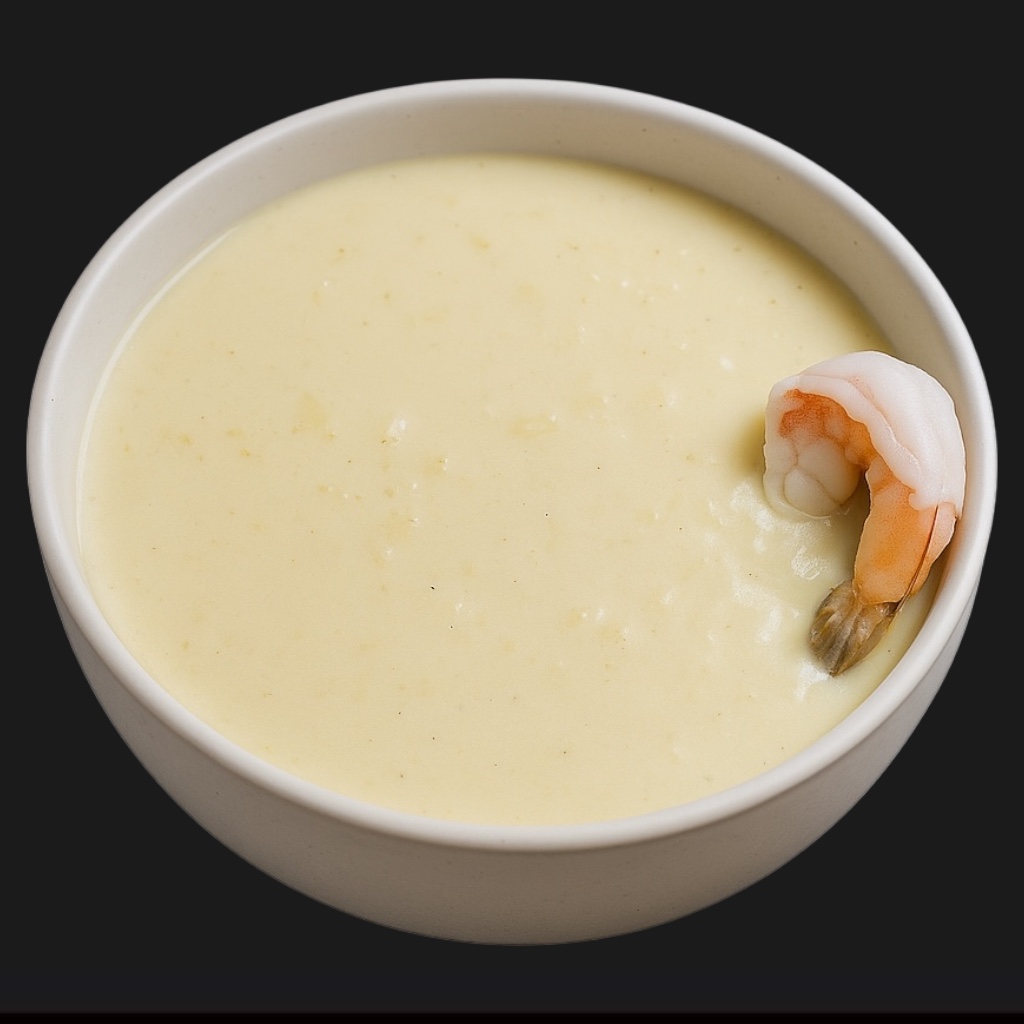 Сливочный крем-суп на основе густого бульона из морепродуктов. Подаётся с ароматными гренками