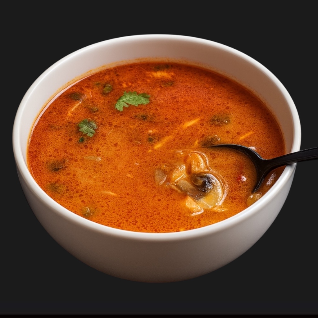 Знаменитый тайский суп на основе куриного бульона с добавлением острой пасты Том Ям. В составе: куриное филе, томаты Черри, шампиньоны, красный лук, лемонграсс, кокосовое молоко. Подаётся с порцией пропаренного риса