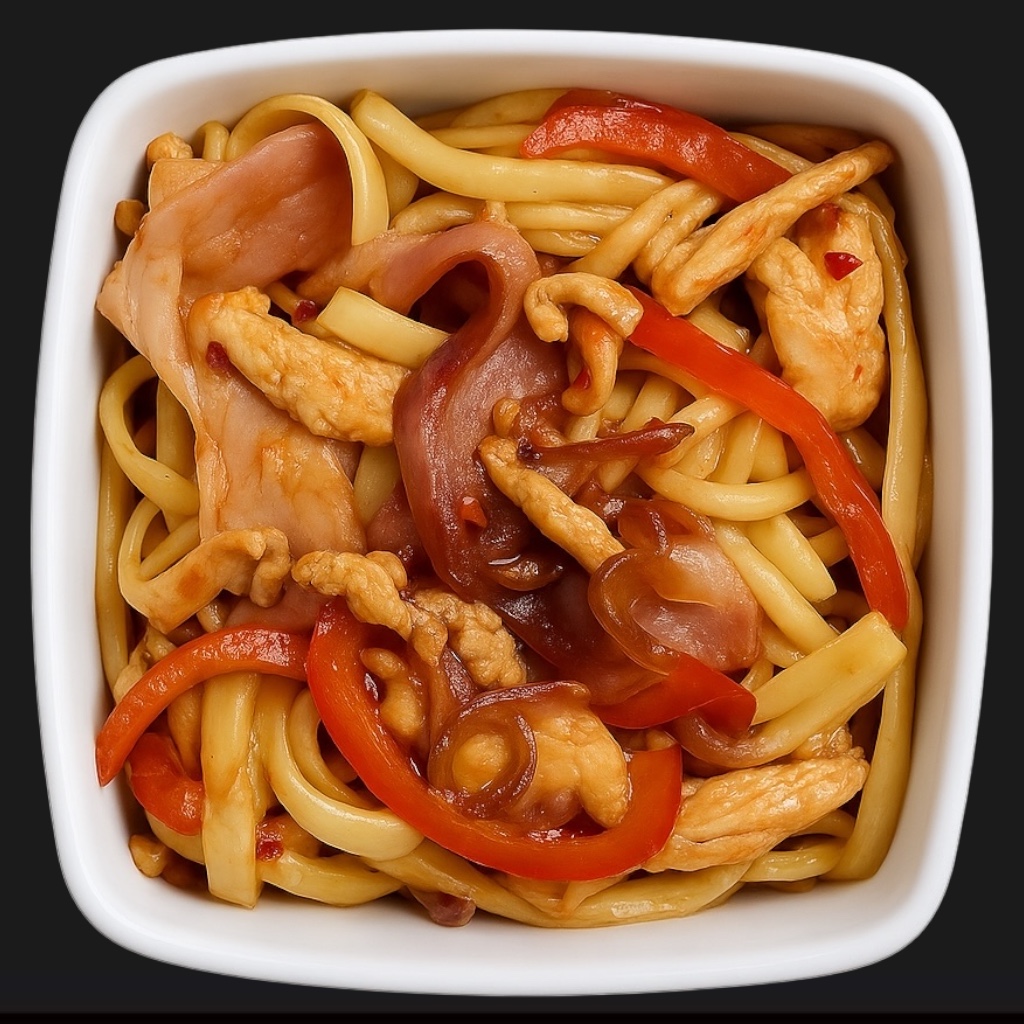 Куриное филе, бекон, лапша Удон, овощи, устричный соус