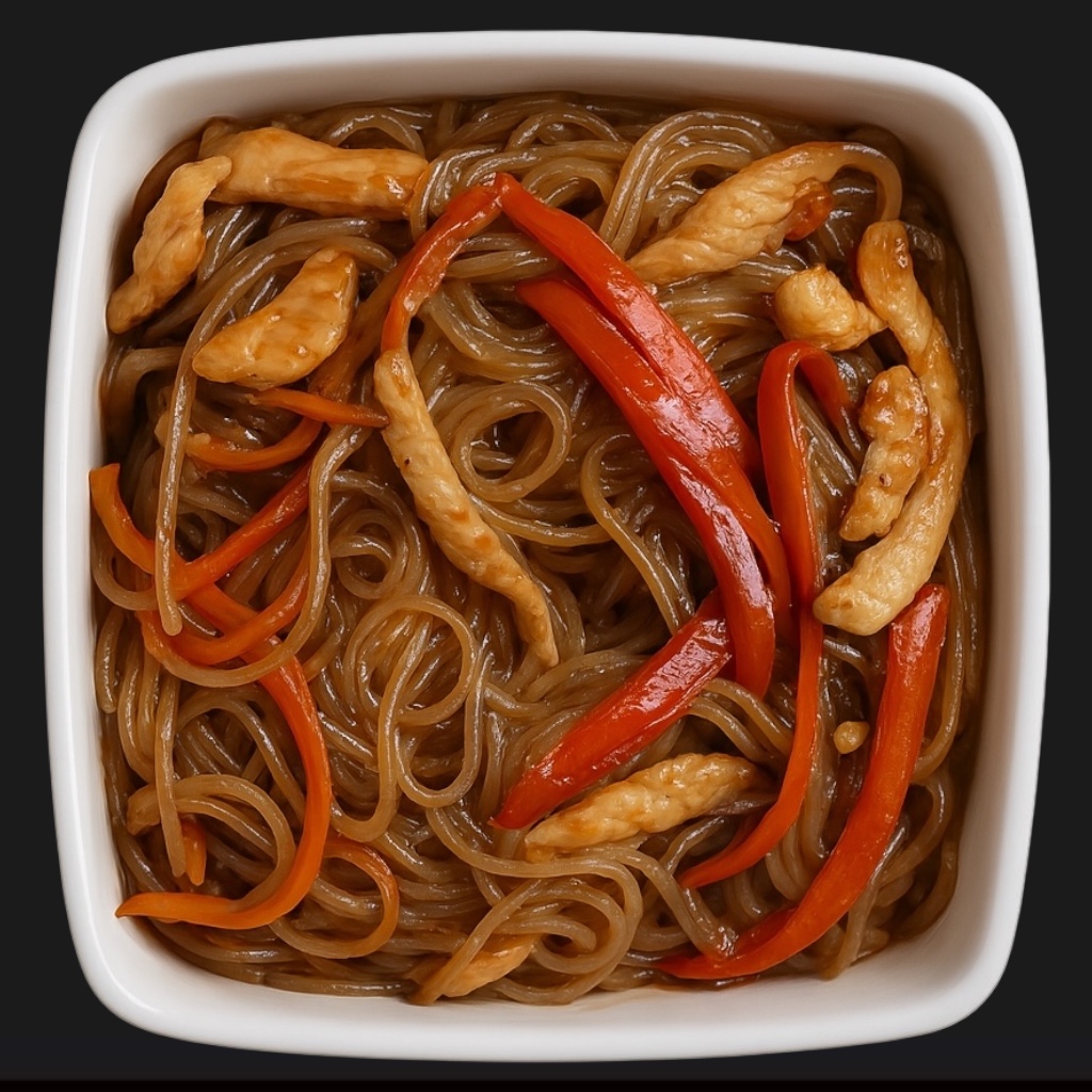 Куриное филе, лапша Фунчоза, овощи, соус Тонкацу