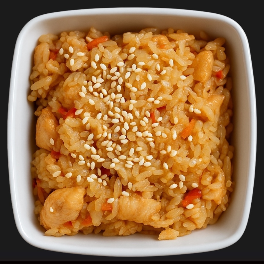 Традиционное японское блюдо из жареного риса с мясом куриного филе, овощами и соевым соусом
